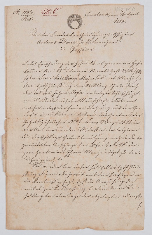 Andreas Illmer († 1855) apparteneva alla cerchia di persone vicine ad Andrea Hofer e prese parte ai combattimenti in qualità di comandante della seconda compagnia della Val Passiria, il fondo archivistico in questione contiene testimonianze autenticate fornite da diverse persone sui servigi da lui resi tra il 1809 e il 1810 e le relative perdite subite, è presente inoltre una richiesta di aumento del sussidio statale a lui accordato nel 1820 nella misura di 50 fiorini. Illmer era sposato con Anna Hofer, una parente di Andreas Hofer, e nel 1811 divenne il tutore dei suoi figli minorenni, ottenne però soltanto diversi anni più tardi un riconoscimento per i servizi prestati. Nel 1840 gli fu conferita la carica di castellano di Castel Tirolo. In veste di queste funzioni redisse le „Scitze ueber die Gefangennähmung des Andreas Hofer – Sandwirths in Passeier. Nebst Anhang die Familie des Hofers und des Verrathers desselben“, pubblicate per la prima volta nel 1909 in occasione del centenario. Andreas Illmer morì il 15 aprile 1855. Il piccolo fondo, ricco tuttavia di informazioni, fu affidato all’Archivio provinciale di Bolzano dai discendenti di Illmer nel 2002.
