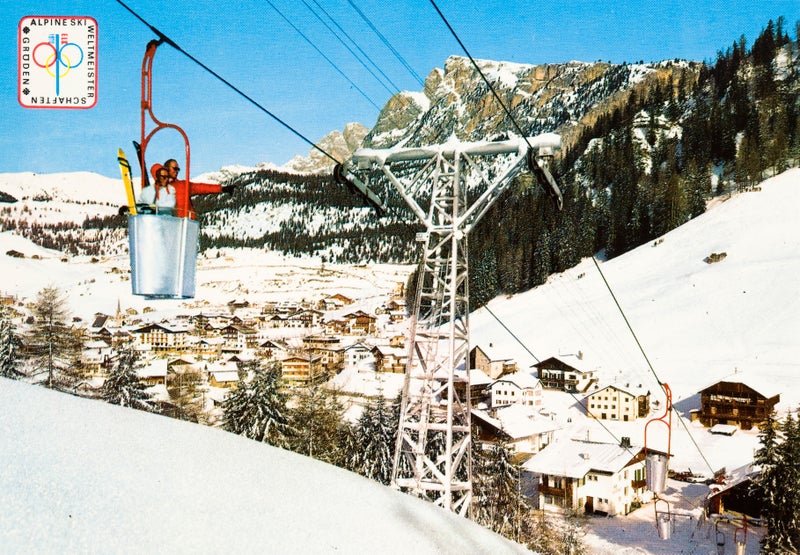 In occasione dei campionati mondiali di sci in Val Gardena furono date alle stampe anche alcune serie di cartoline postali, che immortalavano le località e i comprensori sciistici mettendo in risalto i più moderni impianti di risalita, le ben preparate e lunghe piste da sci e (ritraevano) i paesi immersi in un’atmosfera di modernità.