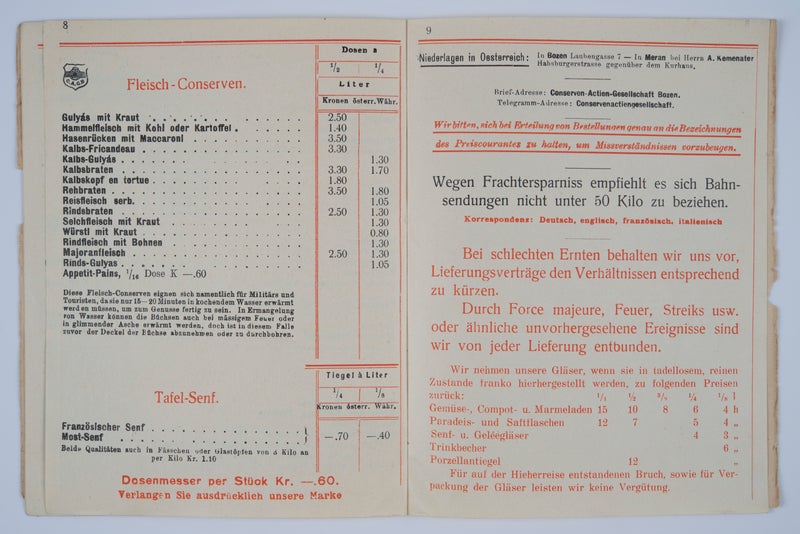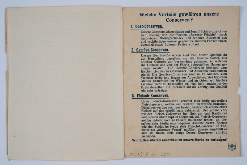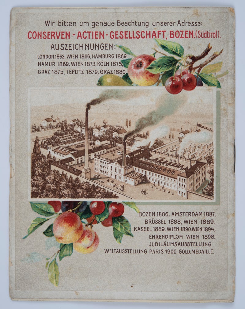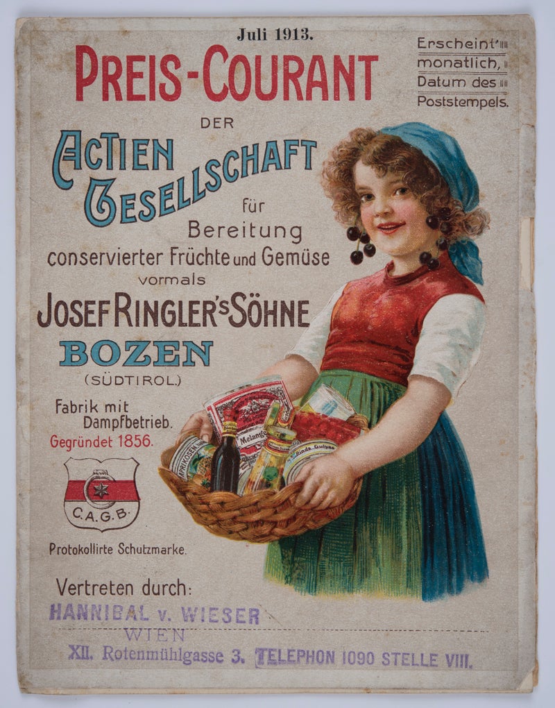 Albicocche, pere, fichi, ciliegie o prugne lessate nello zucchero, nel rum, nel cognac o nell’aceto speziato, succhi e gelatine di frutta, marmellate, composte, frutta candita, pane alla frutta, verdure bollite, verdure e funghi in salamoia, senape e persino piatti di carne già confezionati - in vasetti o lattine: l’assortimento della Conserven-Actien-Gesellschaft (la Società per azioni Conserve Alimentari) di Bolzano era impressionante e molto vario. Questa attività, che per molti anni ha avuto grande successo e origine da un negozio di articoli coloniali sotto i Portici di Bolzano, è stata fondata nel 1856 con il nome di “Josef Ringlers Söhne” (i figli di Josef Ringler) come una delle prime conserviere dell’impero asburgico. In un periodo storico in cui non esistevano ancora i frigoriferi e la frutta e la verdura fresche erano disponibili solo al momento del raccolto con una ridotta possibilità di conservazione, la domanda di cibo in scatola era grande. Tuttavia, anche l’eccellente qualità e il prezzo modesto dei prodotti, per i quali l’azienda ha ricevuto numerosi riconoscimenti – ad esempio all’esposizione mondiale di Londra nel 1862, a una mostra ad Amburgo nel 1869, all’esposizione mondiale di Vienna nel 1873 e all’esposizione mondiale di Parigi nel 1900 – erano fattori alla base del successo e della rapida espansione dell’azienda. Dopo la morte del fondatore della società Carl Ringler, nel novembre 1874, l’anno successivo l’azienda fu trasformata in una società per azioni. Nel 1885, nell’odierna via Renon fu costruito un ampio complesso industriale, realizzato dall’ingegnere e imprenditore edile Albert Canal, originario di Egna, che permise la lavorazione industriale di grandi quantità di alimenti. L’azienda aveva filiali in molte città, i mercati più importanti erano la monarchia asburgica e la Germania, ma il cibo in scatola di Bolzano arrivava fino all’Inghilterra, alla Russia e agli Stati Uniti. Durante il difficile periodo economico tra le due guerre, anche il conservificio di Bolzano dovette fare i conti con le crescenti difficoltà di vendita, tanto che la sede dell’azienda fu chiusa e la ditta continuò in forma molto più piccola dal 1934 in poi - ora di nuovo sotto il nome “Ringler” – l’attività nei locali commerciali sotto i Portici di Bolzano cessò definitivamente nel 1989.