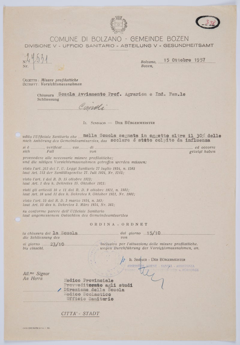 Mentre l’influenza spagnola (H1-N1), che cento anni fa provocò la morte di circa venti milioni di persone, è salita alla ribalta dallo scoppio dell’attuale pandemia, le altre due principali ondate influenzali del XX secolo sono meno note: l’influenza asiatica e l’influenza di Hongkong. L’influenza asiatica, della quale si registrarono i primi casi nel marzo del 1957 in Cina, raggiunse nell’autunno dello stesso anno l’Europa centrale, e nell’ottobre si registrò in Alto Adige un primo picco di contagi. Poiché il virus dell’influenza, che si trasmette attraverso goccioline infette disperse nell’aria, si diffonde in modo particolarmente rapido in presenza di assembramenti di persone al chiuso, non sorprende che anche le scuole fossero colpite dall’ondata di infezione. La scuola di scienze agrarie e domestiche di Bolzano, ad esempio, alla metà di ottobre del 1957 dovette sospendere l’attività scolastica e chiudere brevemente i battenti, poiché più del trenta per cento degli studenti si ammalò di questa nuova influenza. L’ufficio igiene del Comune di Bolzano ordinò una generale disinfezione delle aule scolastiche in tutte le scuole della città, ai custodi degli edifici scolastici fu inoltre raccomandato di arieggiare accuratamente tutti i locali. Il virus H2-N2 dell’influenza asiatica causò la morte di circa un milione di persone in tutto il mondo e ricomparve ciclicamente negli inverni successivi, fino al 1968/69 quando fu soppiantato dal virus H3-N2, noto come influenza di Hongkong, che avrebbe prodotto circa un milione di decessi.