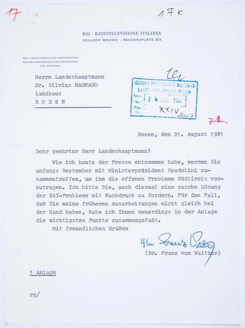 Nel 1974 Franz von Walther fu nominato primo coordinatore delle trasmissioni in lingua tedesca. A causa di un’interpretazione restrittiva delle norme di attuazione dello Statuto di autonomia, la sua responsabilità non si estendeva a tutte le trasmissioni in lingua tedesca, bensì solo a “manifestazioni ed attività artistiche, culturali ed educative locali”. Una circostanza che fu reclamata ancora nel gennaio 1980 dal vicegovernatore provinciale Alfons Benedikter in una relazione circa lo stato di applicazione delle norme di attuazione. Walther dovette attendere il 1990 per vedersi riconoscere dall’allora direttore della RAI, Carlo Corazzola, la facoltà, più volte richiesta, di emanare direttive e un ruolo corrispondente a quello di direttore regionale.