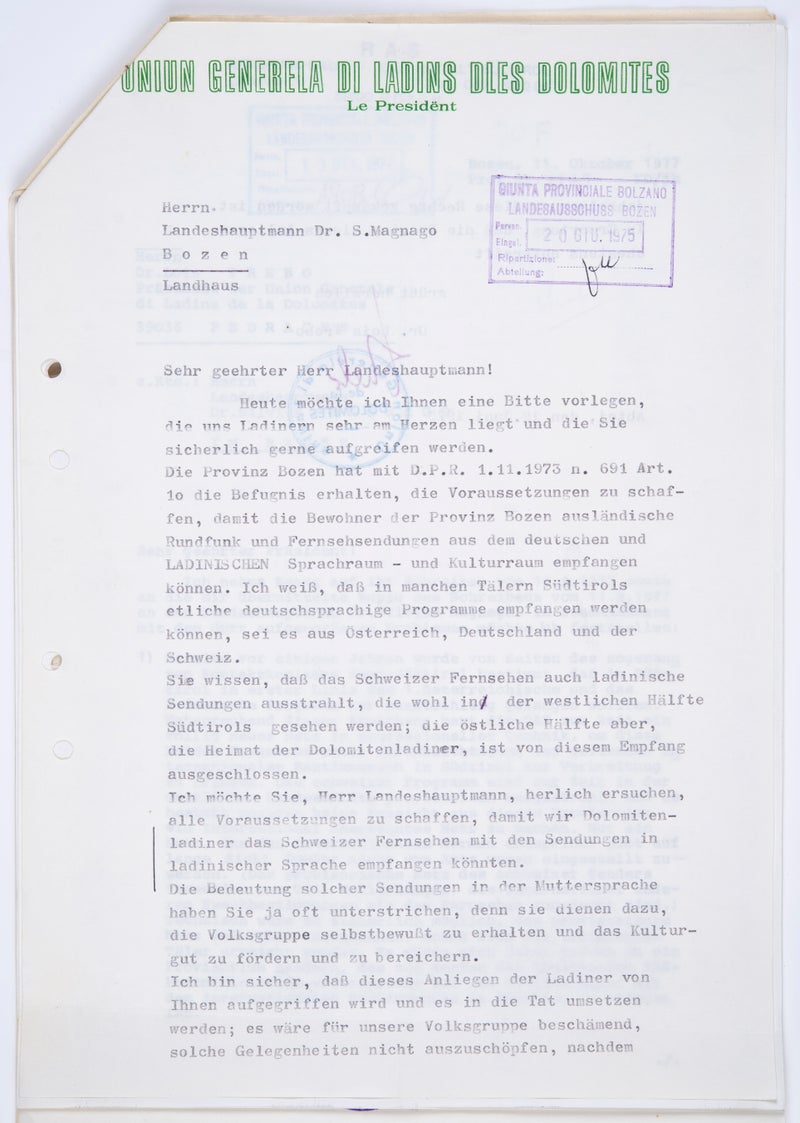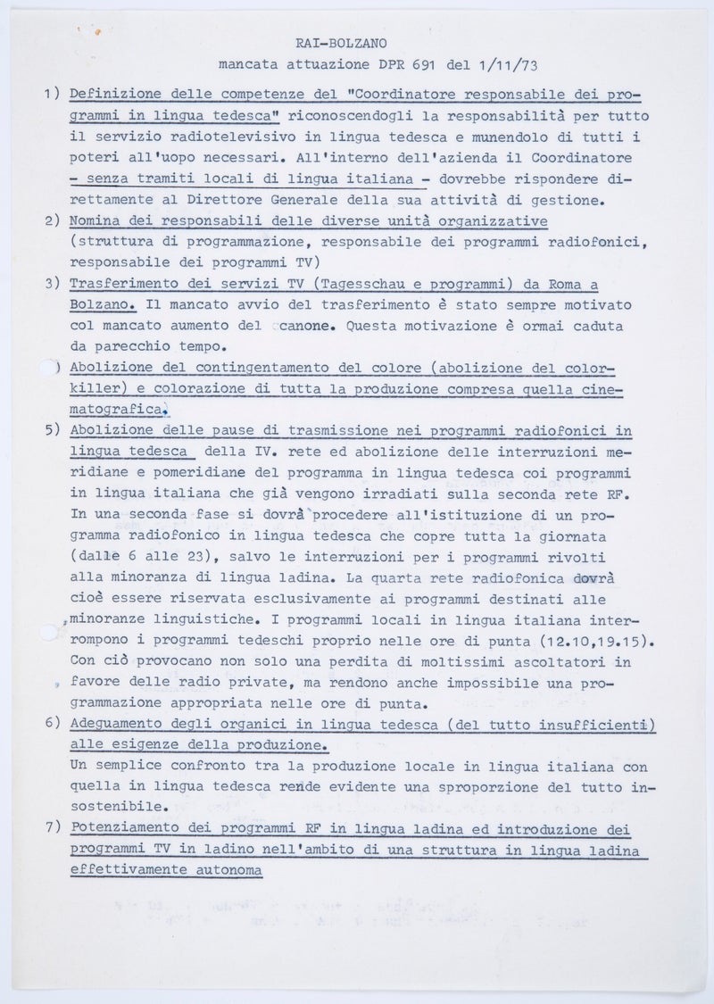 Il 12 giugno 1973, il Governo italiano presieduto da Giulio Andreotti concesse alla Provincia di Bolzano la ricezione di programmi televisivi dall’estero, fino ad allora priva di regolamentazione. Allo stesso tempo, riconobbe il diritto di trasmettere programmi in lingua ladina e preannunciò il ruolo di un “responsabile coordinatore” per i programmi in tedesco. Gli incaricati dalla Giunta provinciale poterono in seguito concludere accordi con le emittenti ORF, ZDF, SRG e ARD per ricevere gratuitamente i loro programmi.
