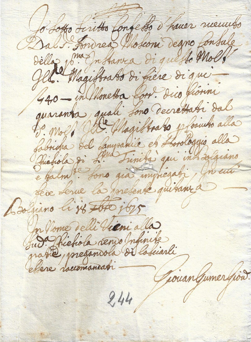 Il Magistrato mercantile, ossia il tribunale delle fiere di Bolzano creato nel 1635 dalla principessa territoriale del Tirolo Claudia de’ Medici, fungeva anche da rappresentante dei mercanti che affluivano a Bolzano dal Nord Italia e dall’Alta Germania per le quattro fiere annuali; le cariche erano ricoperte alternativamente da mercanti tedeschi e italiani. Il console Andrea Mosconi, in carica durante la fiera di Sant’Andrea del 1675, e gli altri membri del magistrato riconobbero probabilmente gli effetti positivi che un orologio da torre avrebbe avuto sugli affari e contribuirono con 40 fiorini. Il 18 dicembre 1675 Johann Gumer, influente commerciante bolzanino, confermò la ricezione della somma.