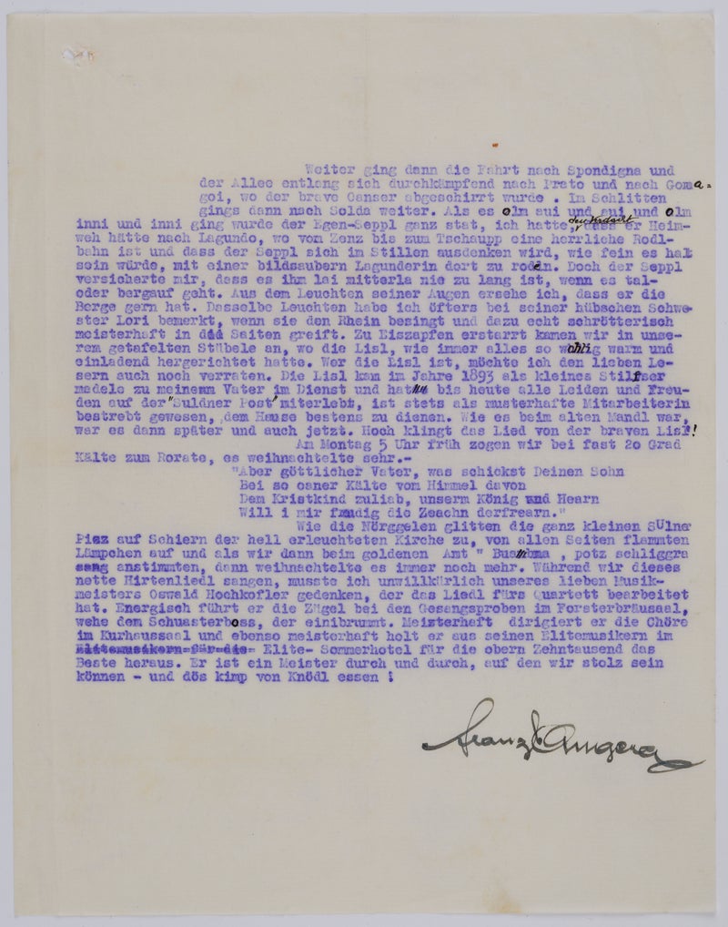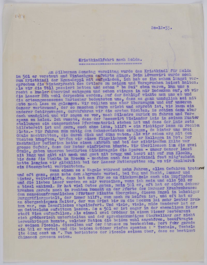 Nel testo umoristico, che scrisse nel 1933 per un giornale locale, accenna al fatto che l’auto non fosse utilizzata solo per trasportare ospiti ed escursionisti stanchi, ma anche in varie emergenze per condurre persone malate o ferite all’ospedale di Merano. Sembra che la Fiat 501 occupasse un posto speciale nel suo cuore, anche se nel 1933 possedeva già una seconda auto, una Ford Type A americana, costruita nel 1929, con la quale lui e suo figlio Hubert ebbero un incidente nel settembre 1933 sulla strada per Solda, ristretta a causa di lavori stradali, come riportato anche dalla stampa locale. Fortunatamente i due occupanti si salvarono senza riportare ferite significative, ma l’auto subì gravi danni.